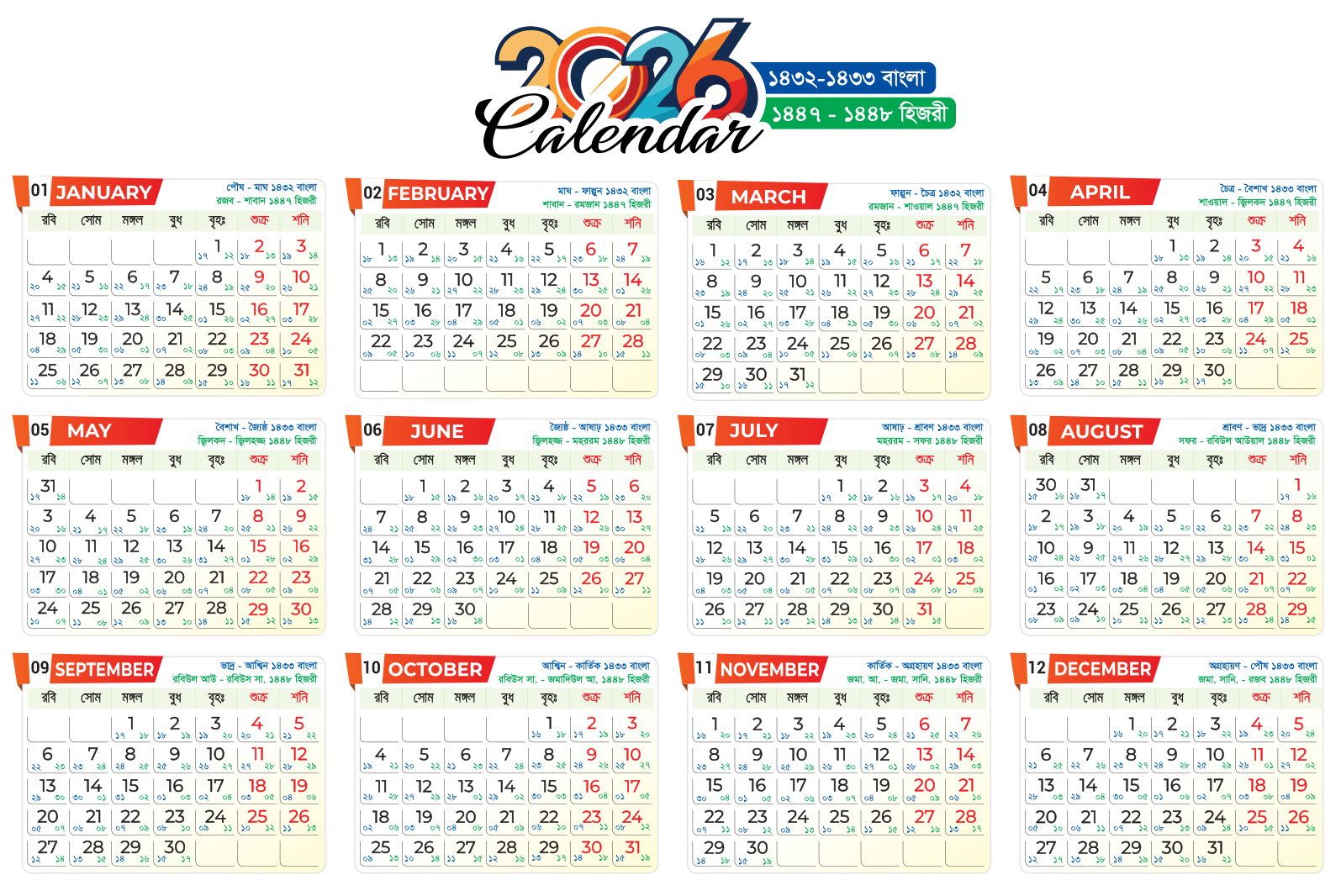 আরবি মাসের ক্যালেন্ডার ২০২৬ (হিজরি সন ১৪৪৭) Arbi maser Calendar